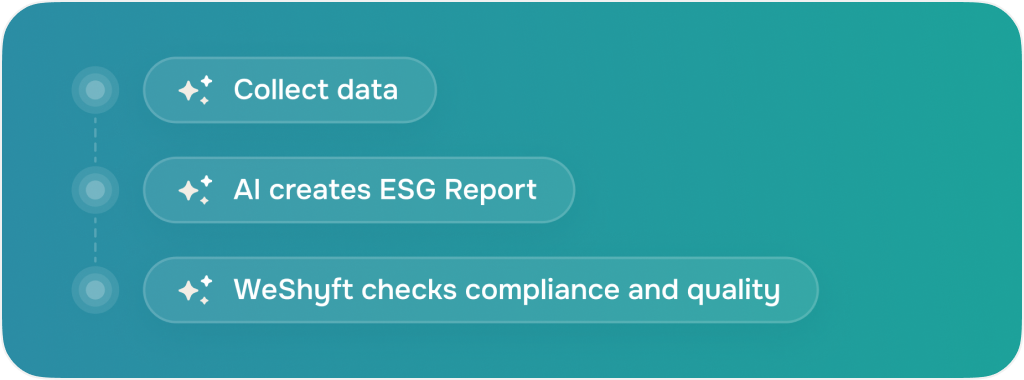 Mit WeShyft können Unternehmen ihr Nachhaltigkeitsreporting effizient umsetzen. Das bedeutet: Daten effektiv erfassen, mit Kolleg:innen zusammenarbeiten und alle Informationen in Berichte exportieren.