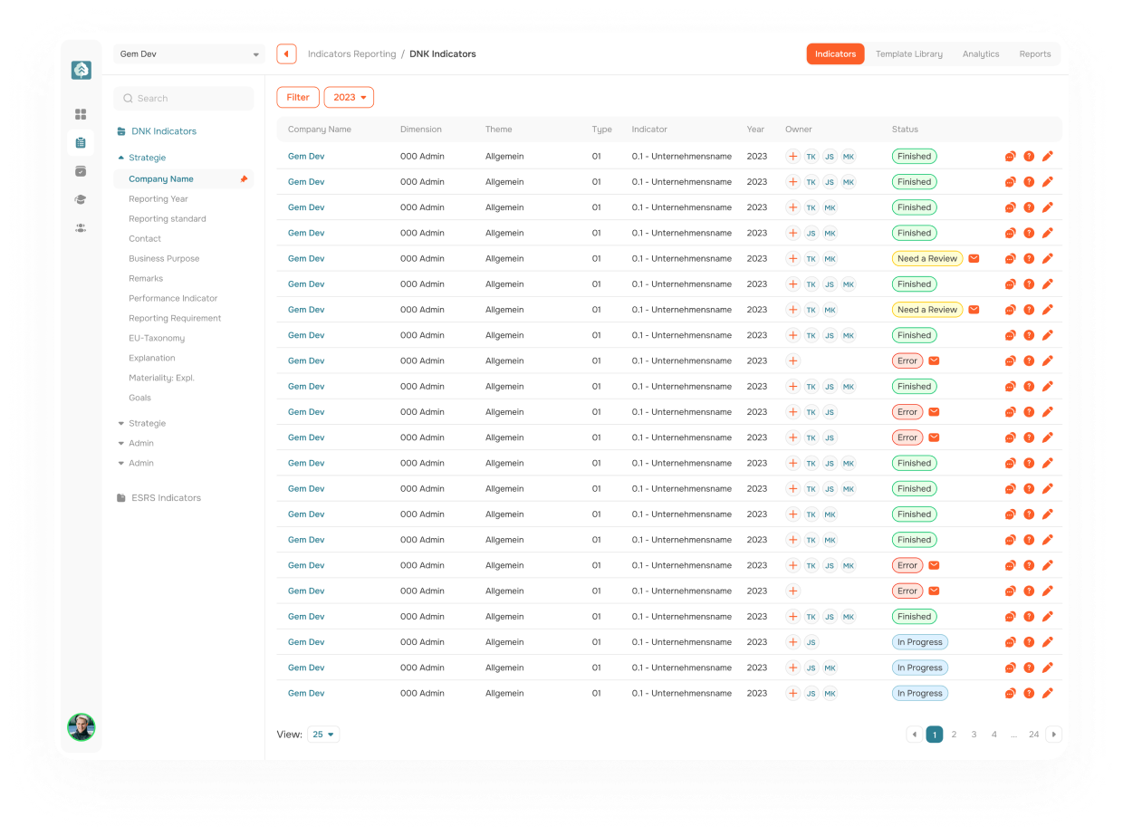 Indikatoren wählen (z.B. aus ESRS, GRI, DNK), Daten sammeln, auswerten und übersichtlich darstellen. Die Berichterstattung kann viel Zeit kosten. Muss sie aber nicht, zumindest nicht mit WeShyft. Wir automatisieren die Datenintegration, vereinfachen die unternehmensweite Zusammenarbeit und erhöhen die Prüfbarkeit aller Prozesse.