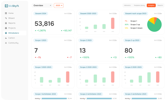 Bilanzrahmen setzen, Aktivitäten wählen und CO2-Emissionen messen. Mit der WeShyft Plattform starten Sie in ein effektives Klimamanagement. Erfahren Sie wo Emissionen entstehen, wie sie diese messen und analysieren mögliche Reduktionsmaßnahmen.